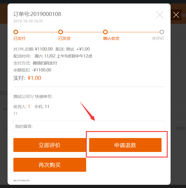 点击查看进入订单详情即可看到退款按钮。如图所示: